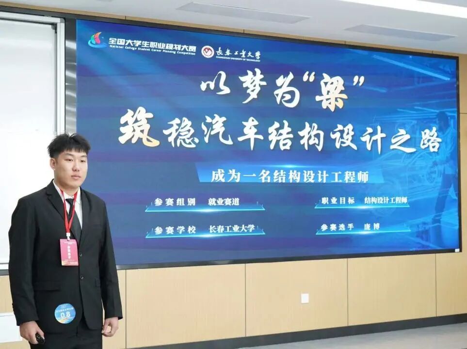 庞博同学以《以梦为“梁” 筑稳汽车结构设计之路》为参赛主题,始终紧扣“成为一名专业可靠的结构设计工程师”这一明确职业目标,认真打磨展示内容、梳理成长路径与发展规划。在就业赛道的展示与答辩环节中,他系统阐述了对汽车结构设计行业的理解与思考,全面展现出扎实的专业基础、严谨的工程思维,以及对汽车结构设计领域的深刻认知与清晰可行的职业规划,充分体现出新时代青年学子立足专业、脚踏实地、追求卓越的良好精神风貌。
